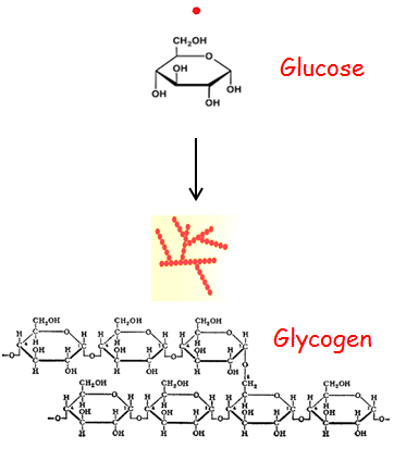 If this is foreign to you, I thought of a simple way of breaking it down that should be easy to understand without any knowledge of biochemistry. When you consume food, your body converts it to dollar bills. Dollar bills are really easy to use. If you go to a store and need to pay 5 dollars you can give 5 one-dollar bills and the transaction will be extremely simple. Excess dollar bills can be consolidated into a dollar bill of greater value such as a 5 dollar bill, or a 10 dollar bill. The singular dollar bills can be thought of as glucose and the greater value dollar bills can be seen as glycogen. Glycogen is a branched polymer (from the Greek word many parts) of glucose itself.
